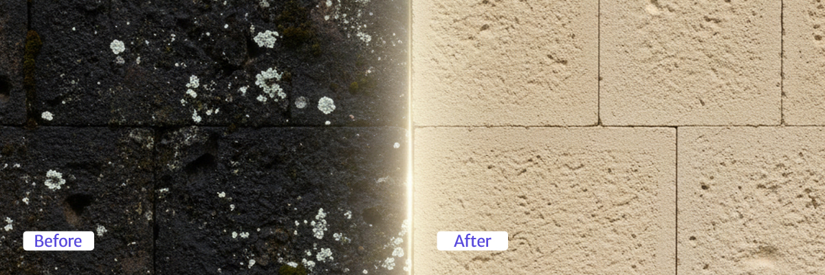 outer surface of the walls. It clears dust, stains, moss, and old
